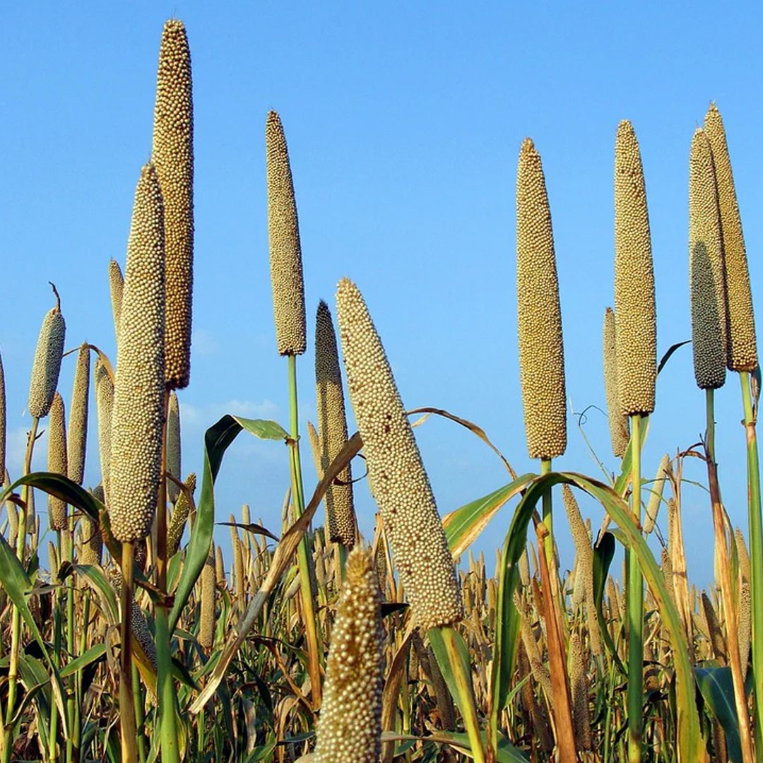 Bajra is a hardy cereal crop that thrives in arid and semi-arid regions. It grows well in poor soils with minimal water, making it ideal for sustainable farming.